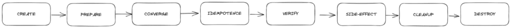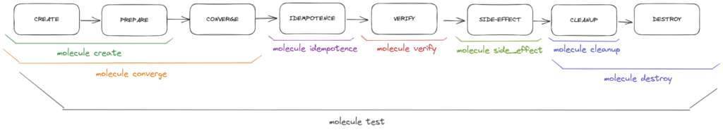 A Molecule scenario is a set of steps performed in a specific order, where each step is an Ansible playbook. Usually, the steps defined in a Molecule scenario are:
